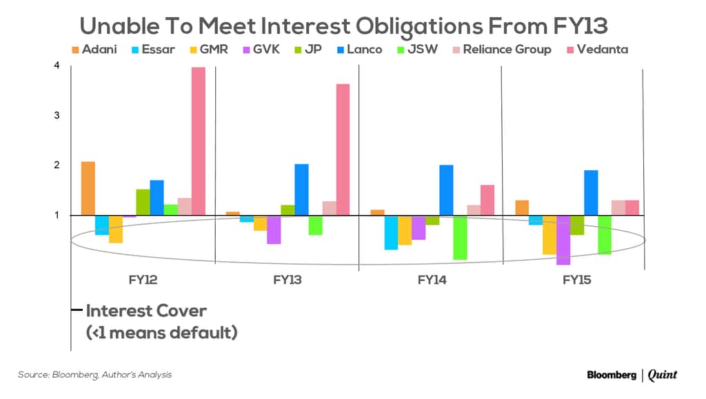 Inevitably, this borrowing binge led to stressed balance sheets. Measured as overall debt to earnings before interest (EBITDA), seven of these corporate groups had dangerously high levels of debt starting FY12, indicating stressed balance sheets. Recall, credit and equity ratings continued to be positive during this time frame even as balance sheets were increasingly getting stretched.