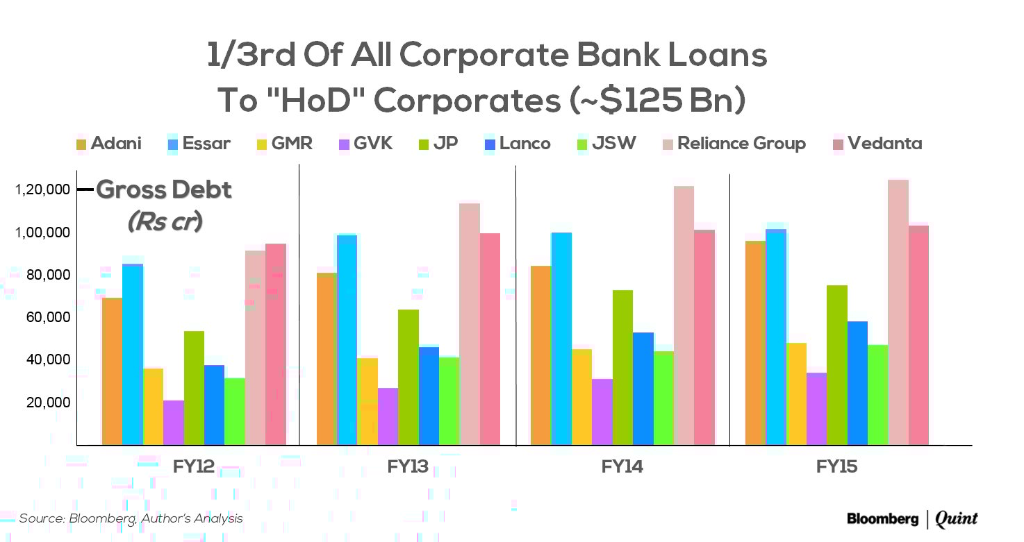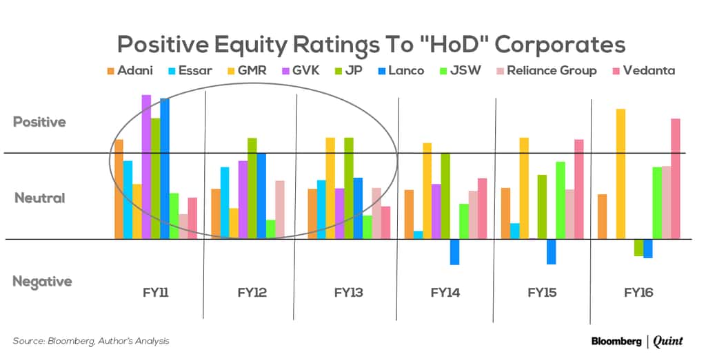 Starting FY13, many of these corporates were not generating enough earnings from their businesses to even meet interest obligations of their borrowings. Measured as the ratio of earnings to interest obligations (interest cover), five of these corporates were in the zone of high risk of default. Nevertheless, the glowing credit and equity ratings for these corporates continued unabated. The net effect of all this is that these “HoD” corporates today account for nearly 20 percent of all distressed loans in the banking system.