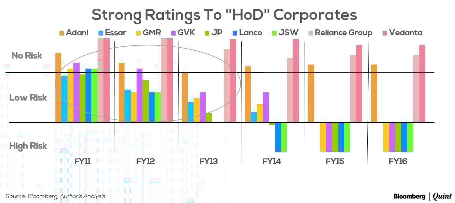 As the chart shows, in the three years from FY11 to FY13, every single one of these “HoD” corporates were deemed to be in the ‘Low Risk’ or ‘No Risk’ category by these credit rating agencies. Only around FY14, some of these corporates began to be downgraded by these agencies to the “High Risk” category. In other words, all these corporates were deemed perfectly risk-worthy by these credit rating agencies to indulge in the kind of borrowing that they did during those years.